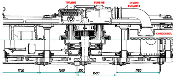 Турбинная установка с редуктором и отбойный вал находятся посредине движущих колёс. То, что выглядит как садовый сарай спереди, является кулером для конденсаторной воды; отверстия в боковой части, предположительно, выходы воздуха. На следующих рисунках показано, что в этих боковых отверстиях установлены вытяжные вентиляторы, хотя на этом изображении они не видны.