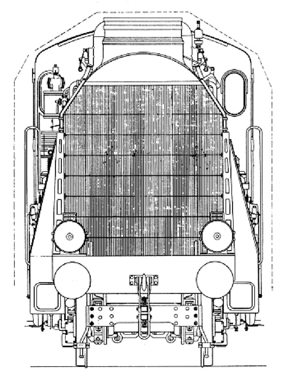 Обращает на себя внимание поверхность конденсаторов с каждой стороны котла. Они охлаждались водой из тендера; эта вода сама охлаждалась при тесном контакте с воздухом, поскольку она распылялась из пучка труб в тендере. В этом процессе терялось значительное количество воды, и общее потребление воды было сокращено только примерно до половины потребления обычного локомотива. Перфорированный обтекаемый носик удерживал вытяжной вентилятор с турбинным приводом; наводящая на размышления труба, видимая в этом корпусе, могла быть источником подачи пара для вентилятора, но это предположение.