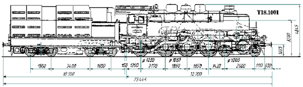 Вид сбоку турбовоза T18—1001 с размерами. Рисунок с сайта «The Self Site: Unusual Steam Locomotives».