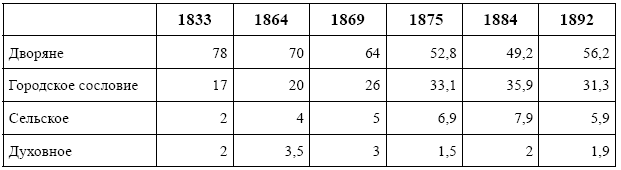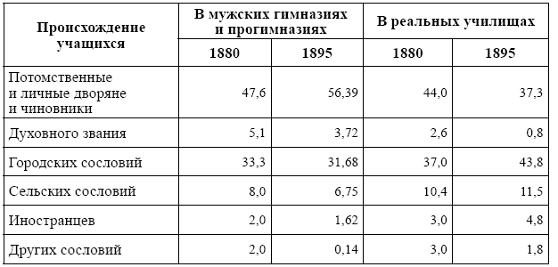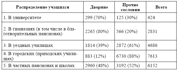 Итак, после отмены крепостного права, несмотря на дискриминационные меры по отношению к недворянским сословиям, при новом типе социальных отношений доля дворянства в составе учащихся учебных заведений, находящихся в ведении Министерства народного просвещения, с небольшими отклонениями постоянно уменьшалась. Уменьшалась доля и самого дворянства в общей структуре населения.