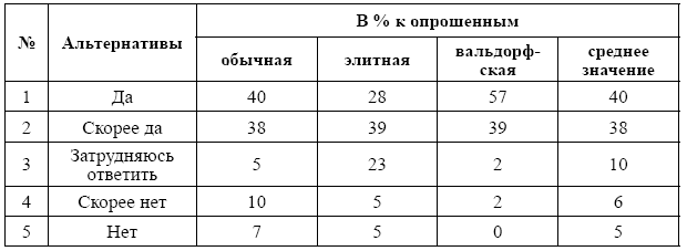 В приведенной выше таблице обращает на себя внимание, что ученики вальдорфской школы примерно в равной степени оценили все значимые факторы: интересно на уроках (21 %), нравятся одноклассники (23 %), нравится школьная жизнь (21 %), нравится учитель (25 %). Заметим, что оценка роли учителя в интересе к учебе выгодно отличает вальдорфскую школу от других школ. В обычных школах высоко оценивают своих учителей 9 % опрошенных, в элитной – 20 %. Среди свободных ответов есть очень показательные высказывания. Некоторым ученикам нравится сам дух вальдорфской школы, другие считают, что общая организация школы выгодно отличает ее от других учебных заведений. Высказывалось также мнение, что школа помогает обрести себя, стать независимой личностью.
