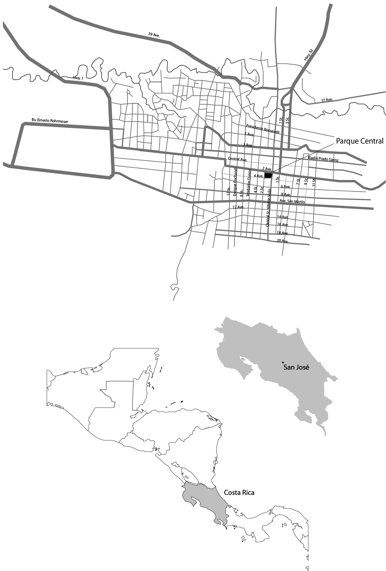 Ил. 3.2. Карты Коста-Рики, Сан-Хосе и парка Сентраль (Эрин Лилли)