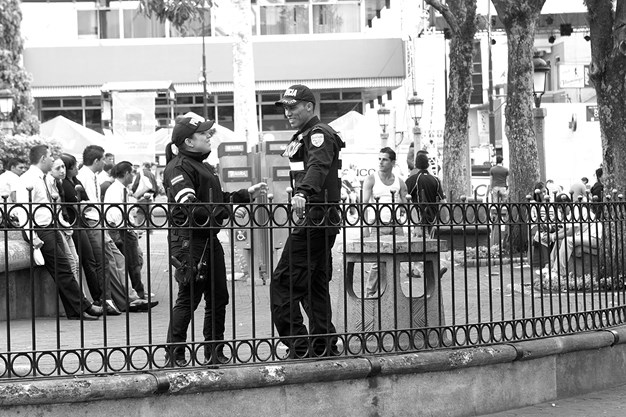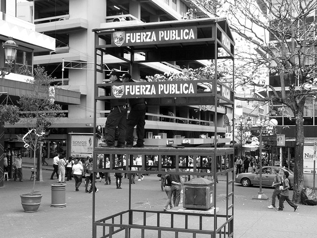 Однако в последующих градостроительных проектах было уделено внимание необходимости создать более значимое общественное пространство с целью стимулирования шопинга, культурных программ и коммерческой деятельности. Вдоль Авениды Сентраль, главного проспекта Сан-Хосе, были оборудованы пешеходная торговая зона и мини-ярмарка, для наблюдения за которыми появились специальные вышки (ил. 3.7). Усиление охраны правопорядка и наблюдение за общественным пространством города с внушительных полицейских вышек начались лишь в 2009 году, но теперь эти элементы стали заметной особенностью как в парке Сентраль, так и в других парках и на площадях (ил. 3.8). В 1985–2000 годах на обеих исследуемых площадях Сан-Хосе34 наблюдалось минимальное количество полицейских, но, судя по полевым наблюдениям 2013 года, к этому моменту их стало больше (ил. 3.9).
