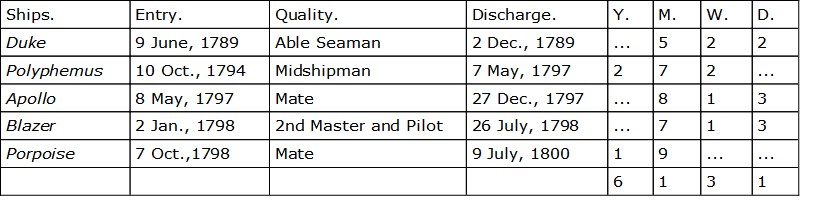"He produceth journals kept by himself in the Polyphemus, Apollo, and Porpoise, and certificates from Captains Lumsdine, Manly, and Scott, of his diligence and sobriety. He can splice knots, reef and sail, work a ship in sailing, and shift his tides, keep a reckoning of the ship's way by plain sailing and Mercator, observe the sun and stars, and find the variation of the compass, and is qualified to do the duty of an able seaman and midshipman.