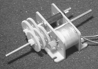 Двигатели постоянного тока для любительского конструирования могут использоваться для движения и перемещения конструкций роботов (см. рис. 4.13). Для большинства таких двигателей характерны высокая частота вращения ротора и небольшой крутящий момент. Конструкции роботов, напротив, требуют большого крутящего момента при невысокой частоте вращения. Для этого могут быть использованы редукторы (см. рис. 4.14). Редуктор характеризуется передаточным числом, т. е. отношением скоростей вращения на входе и выходе. Например: двигатель с частотой вращения 8000 об/мин соединен с редуктором, имеющим передаточное число 1000:1. Какова будет скорость на выходе редуктора? 8000 об/мин: 1000=8 об/мин. Соответственно возрастет крутящий момент. Можно ожидать, что крутящий момент увеличится в той же степени, в которой снизились обороты. Практически, поскольку КПД любого устройства всегда меньше 100 %, крутящий момент будет несколько ниже из-за потерь.