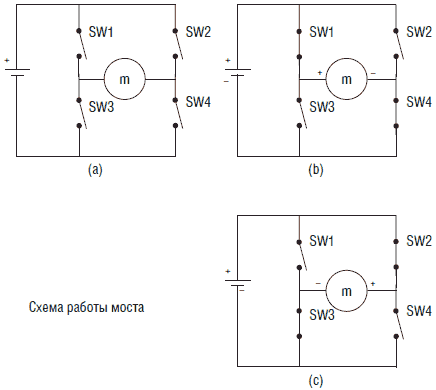 При конструировании робота желательно наличие простой схемы управления его включением и выключением. Кроме того, необходима схема реверса направления вращения двигателя. Таким требованиям удовлетворяет мостовая схема управления.