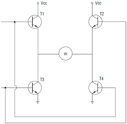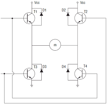 Двигатель является индуктивной нагрузкой. В моменты включения/выключения возникающее переходное напряжение, генерируемое обмотками двигателя, может повредить полупроводниковые части моста. Для гашения этого напряжения используются защитные диоды, включенные параллельно транзисторам, как показано на рис. 4.19.