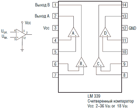 Рис 5.1. Схема компаратора и счетверенный компаратор на ИС LM 339