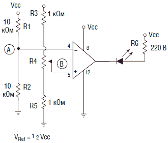 Многие, и я в том числе, находят работу подобной схемы несколько неестественной. Более привычным является зажигание светодиода при превышении Vвх. над Voп. Это можно легко сделать, поменяв местами подключения входов компаратора, т. е. присоединив Vвх. к инвертированному входу компаратора, а Voп. к неинвертированному соответственно. Функция выхода изменится при этом на противоположную.