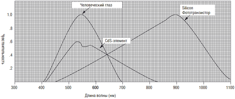 Рис. 5.6. Диаграмма, показывающая сравнительную спектральную чувствительность глаза и светочувствительных датчиков