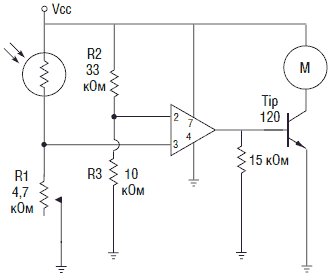 На рис. 5.7 приведена основная схема устройства. Поскольку CdS-преобразователь представляет собой резистор, он может быть включен напрямую в делитель напряжения. По мере нарастания освещенности сопротивление фоторезистора падает. Соответственно, повышается напряжение на резисторе R1 и на выводе 2 ИС. Когда напряжение превысит напряжение на выводе 3, включится двигатель M. Порог срабатывания регулируется подстроечным резистором R1 4,7 кОм. Такая схема является основной для управления «солнечным шаром», описанным в гл. 12.