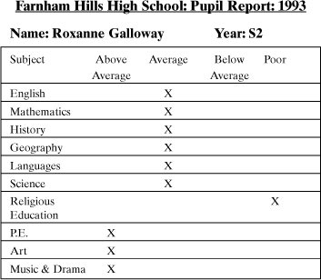 Roxanne continues to be a challenge in areas of discipline, structure and responsiveness to authority. Her attendance score was 72 per cent this year, although that is expected to improve after our joint discussions with the amusement arcade and village café. She is, as agreed, now barred from both within school hours.
