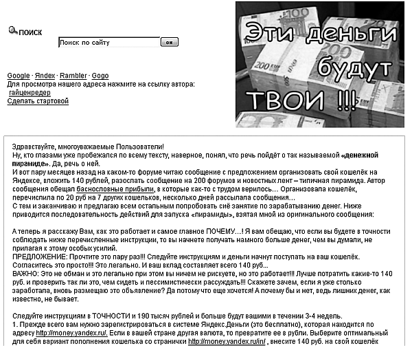 На первом месте как тогда, так и сейчас прочно сидит неубиваемый МЛМ (MLM – multi-level marketing, многоуровневый маркетинг, больше известный как «финансовая пирамида»). Здесь все так же, как и в реальной жизни: вы платите некоему пылкому молодому человеку (или девушке – но, скорее всего, это толстый бородатый дядька лет сорока, прикинувшийся шлангом) с совочком и ведерком скромную сумму (как правило, запросы мошенников-млм-щиков не превышают трехсот рублей) и получаете в награду рассказ о способе заработать много-много денег. Чтобы это «совсем-совсем заработало», нужно найти еще пятерых-шестерых таких же лохов и переслать им это же письмо. Только один из реквизитов для перечисления денег заменить на свой. В общем, типичная пирамида. Правда, никто вам не мешает поменять не один из реквизитов, а все – на созданные вами виртуальные кошельки. Подозреваю, что так поступают большинство, так что пирамида получается довольно хиленькой, но действенной. И, как в любой пирамиде, выигрывают только те, кто наверху (рис. 1.5).