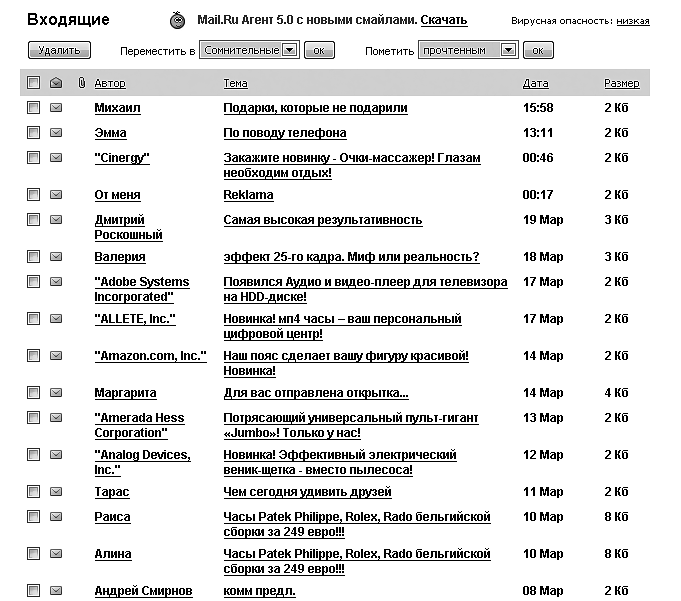 Спам в e-mail почитать иногда можно – но чисто для развлечения, да и то если больше нечего делать или же вы слишком пьяны, чтобы читать и адекватно воспринимать обычную почту (рис. 2.2). Иногда спамеры пишут веселые вещи. Например, бывают письма от девушек, которые просят зайти куда-то там и проголосовать за них. Очень много писем, как я замечал, связаны с предложением таких вот рассылок. Риторическим для меня остается вопрос «Кому это нужно?». Нормальный здравомыслящий человек спаму доверять не будет – если этот спам не призывает его воспользоваться какими-то противозаконными услугами вроде фальшивых дипломов, поддельных паспортов и прочего.