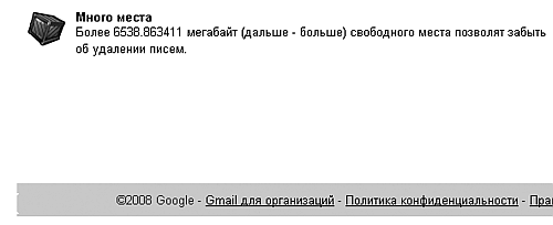 У GMail на день сегодняшний есть одна уникальная особенность: в эту систему не может прийти кто попало. Зарегистрироваться в GMail вы сможете только в том случае, если кто-то, имеющий аккаунт в этой системе, пришлет вам специальное приглашение. Если у вас нет такого знакомого, то вы туда не попадете. Большой плюс системы – огромное пространство, которое увеличивается буквально ежесекундно (на март 2008 года цифра медленно подползала к объему в 6,5 Гб – даже не представляю, кому нужно столько места (см. рис. 2.4).