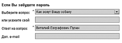 6. Переходим к разделу Если вы забудете пароль. Здесь вам нужно будет выбрать контрольный вопрос в одноименном поле (рис. 2.9). Для чего это нужно? Представьте себе ситуацию, когда вы забыли-таки пароль, второго ящика у вас нет, и что делать – не знаете. Пароль не вспоминается, в ящике скучают очень важные данные: вот для таких случаев и предназначен контрольный вопрос. Выберите из списка один из вариантов (или укажите свой), а в поле Ответ на вопроснапишите правильный ответ, соблюдая регистр букв. Теперь в случае, если вы забыли пароль, вам нужно просто ввести в специальном поле ответ на контрольный вопрос – и все! Пароль будет восстановлен.