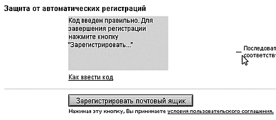 10. И последнее поле – Защита от автоматических регистраций.Здесь вам нужно нажатием на виртуальные кнопки ввести ряд иероглифов (на некоторых, более человечных сервисах используются и буквы с цифрами), которые вы видите на рисунке справа от поля. Если вы их не видите, значит, в вашем браузере выключено отображение картинок. В этом случае включите его и перезагрузите страницу. Это поле нужно для предохранения системы от автоматических регистраций, использующихся для рассылки спама. При каждой регистрации нового пользователя или при перезагрузке данной страницы контрольные символы меняются.