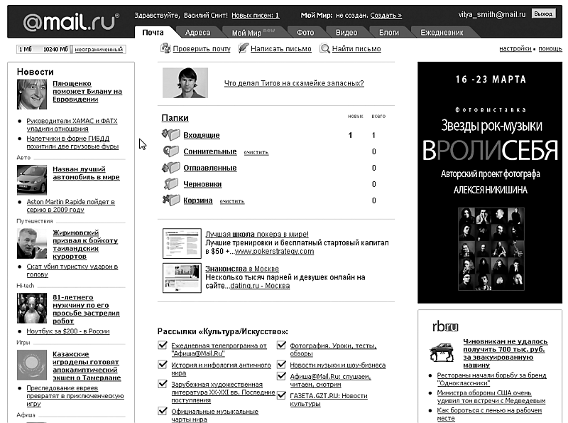 Итак, вы вошли в свой почтовый ящик, введя логин и пароль. Вашему вниманию предстает стандартное окно (в большинстве систем оно, как правило, по структуре выглядит именно так): слева размещаются названия папок, сверху – доступ к дополнительным функциям, по центру – содержимое папки, в которой вы сейчас находитесь (рис. 2.14). Если вы вне каких-либо папок, то они могут располагаться и по центру, как в Mail.Ru. А все свободное пространство завалено рекламой.