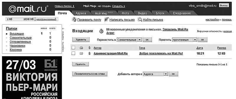 Как вам уже известно, все крупные (и почти все мелкие) почтовые сервисы предлагают два вида работы с электронной почтой: через веб-интерфейс или через почтовую программу-клиент (называемую умным словом мэйлер). В данном разделе вы узнаете о том, как работать со своим почтовым ящиком с помощью браузера через интерфейс, предлагаемый почтовым сервисом. Как правило, операции во всех системах практически одинаковы и различаются лишь внешним видом и дополнительными функциями. Работу с веб-интерфейсом я рассмотрю на примере почтовой службы Mail.Ru, в которой создал свой аккаунт в предыдущем разделе.
