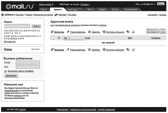закладка Адреса открывает вашу адресную книгу, где вы можете сохранять, добавлять или удалять контакты (рис. 2.18). Также некоторые сервисы предоставляют возможность импортирования адресной книги из Outlook и/или The BAT!. Более подробно об адресной книге вы узнаете чуть позже;