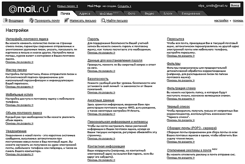 нажатие на закладку Почта будет эквивалентно ранее рассмотренной команде Проверить почту, но активна эта команда в том случае, если вы находитесь не в самом ящике, а в его настройках;