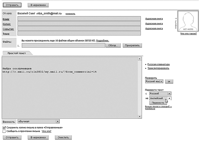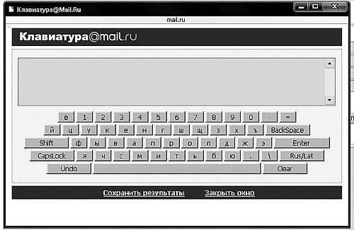 5. Самое большое безымянное поле – это, собственно, текст письма. При наборе вы можете пользоваться дополнительными услугами, например проверкой правописания, транслитерацией букв с русского языка на латиницу и наоборот (в случае, если у вас нет русифицированной клавиатуры либо у получателя не отображается русская кодировка), а во многих системах есть и виртуальная клавиатура (письмо можно набрать, нажимая на нужные клавиши кнопкой мыши) (рис. 2.22).