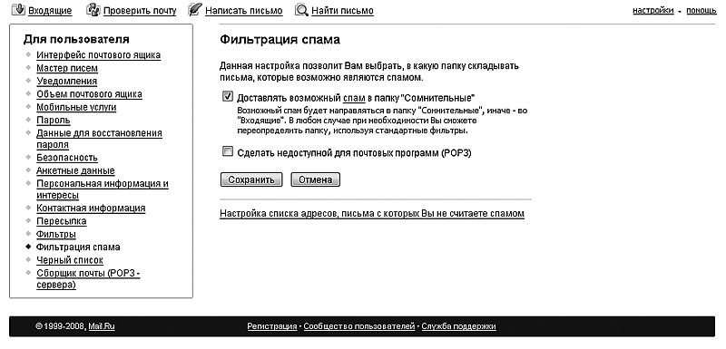 4. Как вы видите на следующей странице (рис. 2.25), по умолчанию механизм фильтрации спама переадресовывает все письма, похожие на спам, в папку Сомнительные. Чтобы отключить эту настройку, сбросьте флажок Доставлять возможный спам в папку Сомнительные, после чего весь спам будет наравне с обычными письмами помещаться в папку Входящие.