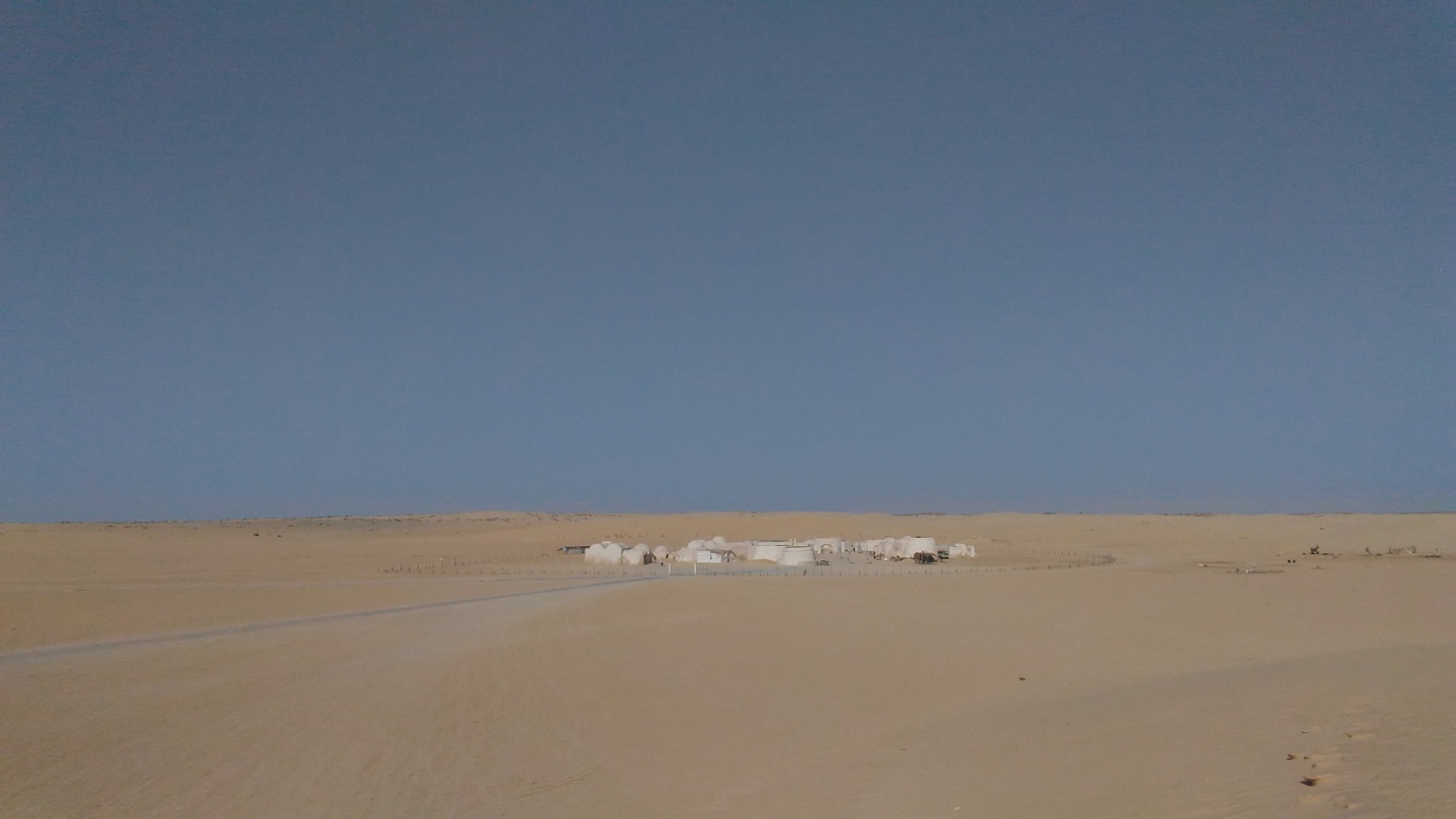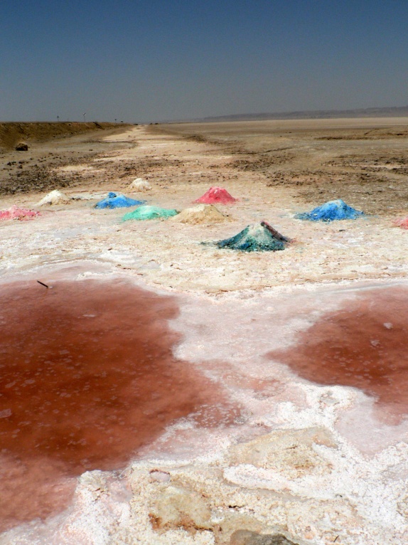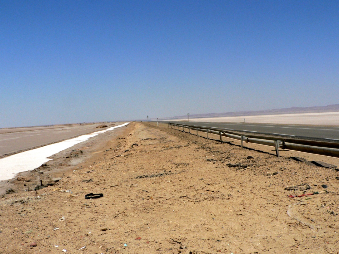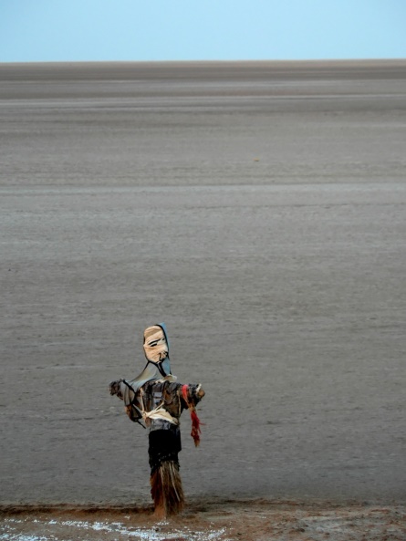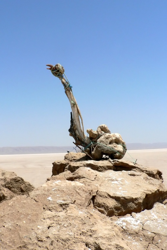 Как напоминание о невидимых опасностях огромного солончака, недалеко от дороги с обеих сторон кто-то соорудил большие фигуры: каменный верблюд грустно стоит рядом со своим недавно умершим от жажды каменным же хозяином; мертвая птица, выложенная из камней и чьих-то костей, безнадежно пытается взлететь, навечно прилипнув к смертоносным топям; фигурка человека, в паническом страхе раскинувшего руки, безнадежным взглядом взирает на абсолютно неуместный и тем еще более пугающий черный шалаш, непонятно как до сих пор стоящий на неверной зыбкой поверхности.