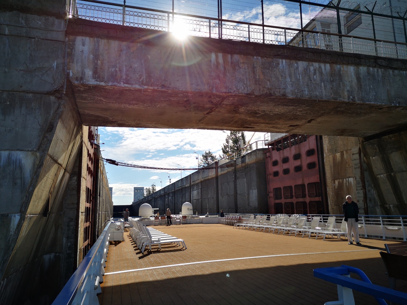 Первая пара шлюзов наверняка запомнится мне на всю жизнь, ведь это же так интересно – перебегать по верхней открытой палубе на разные стороны корабля и смотреть, как наш капитан ювелирно входит в узкие открытые ворота, а затем – как поднимается вода по никогда не высыхающим, зеленым стенам, и вместе с ней поднимаемся мы. Эко ли не чудо!