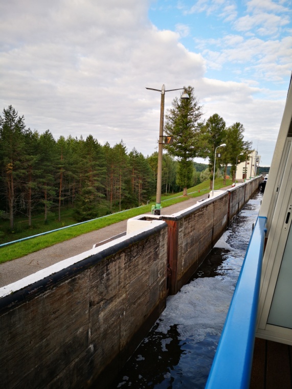На каждом шлюзе есть закрытая кабинка или даже целое небольшое здание, откуда непременно каждый раз выходит усталая тетенька и отдает Бог знает кому какие-то важные команды. Она с полным безразличием смотрит, как любопытные туристы перебегают от борта к борту, боясь пропустить хоть что-либо интересное. И мне почему-то кажется, что каждой такой тете они представляются не иначе как надоевшими тараканами, которых бы тапком, тапком бы! Чтобы зазря не бегали, и она бы уже спокойно могла пойти домой и просто поспать, а не стоять тут каждый день в любую погоду, пропуская туда-сюда бесконечные баржи и теплоходы, навроде нашего.