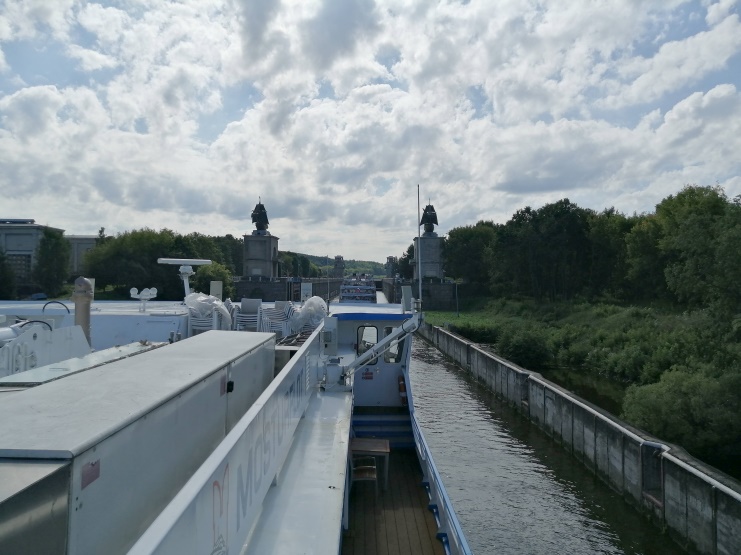 В остальном же канал имени Москвы представляет собой систему из семи шлюзов, где наш теплоход все поднимали и поднимали на нужную высоту.