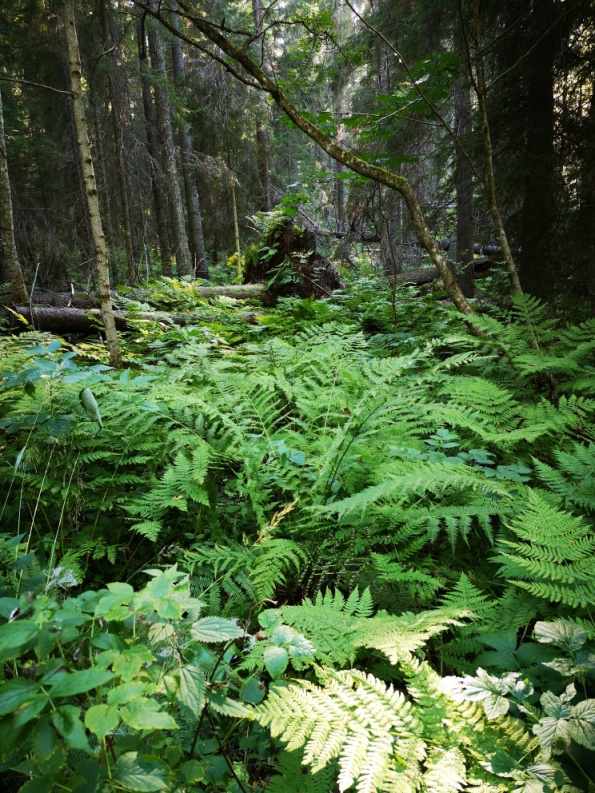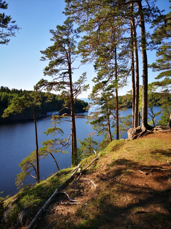 Ярко-бирюзовые и изумрудные светлые, малахитовые и темно-зеленые, серые, словно нарисованные карандашом, и практически черные смоляные ветви высоких корабельных сосен окружают здесь путника, плотно переплетаясь над головой. Под ногами хрустят опавшие иголки и мох. То тут, то там из-под пушистых юбочек маленьких елок и из травы выглядывают мухоморы, маслята, белые грибы. Далеко на горизонте иногда просматривается синяя гладь Ладожского озера. Часто по дороге встречаются небольшие озера с темной непрозрачной водой. И вокруг царит полная тишина: ни крика птицы, ни шороха лесного зверя. Вновь создается впечатление, будто бы окружающая природа наблюдает за тобой, изучает тебя так же, как ты сейчас изучаешь ее…