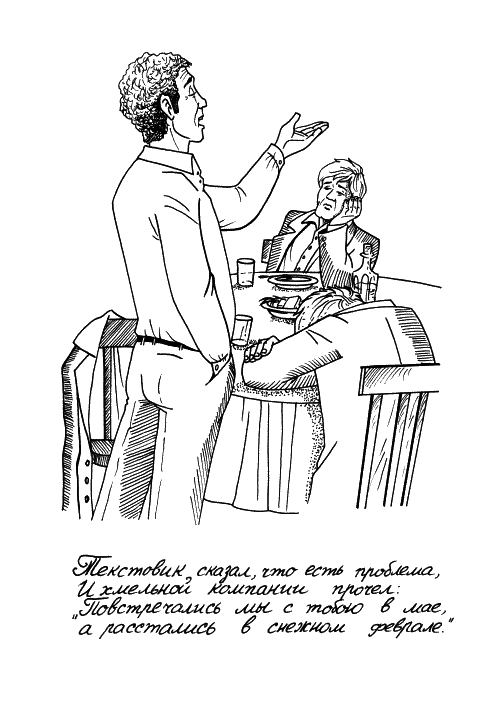 Композитор, музычку придумав,Показал ее текстовику.Текстовик с пера пылинки сдунулИ «нащупал» первую строку:«Повстречались мы с тобою в мае!» —Понял, что начало одолел,И продолжил, кошку обнимая:«А расстались в снежном феврале!»То ли вдохновения не хватило,То ли рифмы ветром унесло,Только с текстом вдруг закоротило —Ни одной идеи. Как назло!Подходил к столу четыре раза,Позабросил важные дела,Только привередливая фразаВ этот день, зараза, не пришла.Поразмыслив, что заняться нечем,Что пора набраться свежих сил,К Дому литератора под вечерТекстовик подъехал на такси.Возле гардероба встретил друга.С ним был незнакомый мрачный тип.Тот, помяв протянутую руку,Предложил зайти и «пропустить».Друг сказал, что нет в кармане «мани»,Что уже полгода «на мели»…Обошлось без тягостных ломаний —Мрачный тип расщедрился. Зашли…Здесь куда ни плюнь – везде приятель,Здесь куда ни глянь – кругом свои.После поцелуев и объятийЗаказали столик на троих.Выпили без видимых усилий,Скушали «цыплят-на-вертеле»,После третьей снова закусили,Закурили. Друг повеселел,Рассказал десяток анекдотов,Выдал новый матерный стишок.К ним придвинул стул четвертый кто-то,Снова пили. Стало хорошо.Текстовик сказал, что ищет Тему,Что грядущей книгой увлечен,Но мешает мелкая проблема, —И хмельной компании прочел:«Повстречались мы с тобою в мае,А расстались в снежном феврале».Друг сказал: четвертая такая:«Видно, так бывает на земле!»Выпили за вечное искусство,Опьянели. И уже внизуЦеловались от большого чувства,Утирая пьяную слезу.Тот, четвертый, в водочном угареЧей-то бюст в объятиях душил.Наконец, уже на тротуаре,Друг воскликнул: жертвую, пиши!«Мы с тобою повстречались в мае,А расстались в снежном феврале.Что мне делать, я не понимаю!!!Видно, так бывает на земле!»Текстовик в ответ промямлил что-то,Записал куда-то и порвал,Выбросил. С улыбкой идиотаСнова записал. Потом – провал…Утром было гадко и тоскливо:Как мартен гудела голова,Как большой любви, хотелось пива,Как от ветра, путались слова.День прошел на редкость бестолково,Следующий канул в суете.Только на четвертый «мастер слова»С горем пополам закончил текст.Композитор с рифмами не спорил.Спонсор тоже в творчество не лез.Закрутилось, понеслось, и вскореПесня зашагала по земле.Томная грудастая блондинка,Что знакома всем наверняка,Записала песню на пластинку,Песня «пронеслась» по кабакам.В утренних эфирах прозвучала,В сборники попала, наконецНезаметно, скромненько скончалась,Не задев ни мыслей, ни сердец.Я недавно слышал, как динамикИз окна орал на весь район:«Видно, так случилось между нами,В январе со мной расстался он!..»Значит, снова, музычку придумав,Кто-то дал ее текстовику,Чтобы нас вгонять эстрадой-дуройВ тупость, безнадегу и тоску.Как же быстро все меняется в этом мире… Стихотворение, безусловно, принадлежит к тому времени (1983 год), ведь сегодня ситуация в песенном цехе абсолютно иная – и в Доме литератора литераторов не найдешь, да и механизмы «раскрутки» стали другими. Вот только подход к работе остался прежним…