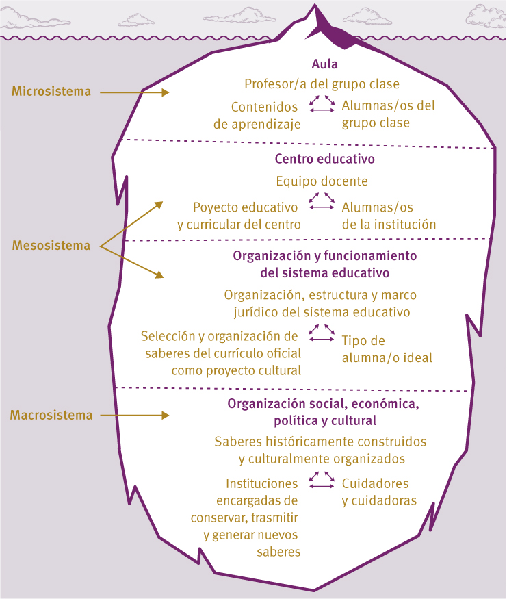 El acoso, la agresión o la violencia sistemáticos en los entornos escolares es la punta del iceberg de un determinado sistema que produce, premia e invisibiliza el fenómeno. Según la perspectiva sistémica-ecológica y la constructivista sociocultural, el sistema educativo como tal se define como un sistema abierto que se concreta de acuerdo con este esquema: