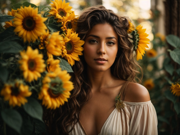 The gods, moved by the nymph’s unwavering love, decided to transform her into a golden sunflower. As Clytie’s transformation took place, her face and hair turned into a radiant golden petal crown, while her body grew into a tall, slender stem. Her feet took root into the earth, anchoring her firmly.