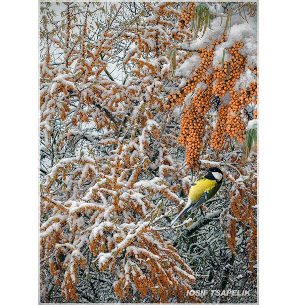 На куст облепихи синичка присела,Попробовать ягодку птичка хотела,Хозяин увидел ее из окна,Как в музыке цвета застыла она.Схватил он немедленно свой объектив,Чтоб не упустить этот зимний мотив,И вышло такой красоты полотно,Как будто бы золотом шито оно.Картинку впервые увидели мыС названием «Первая проба зимы».