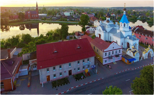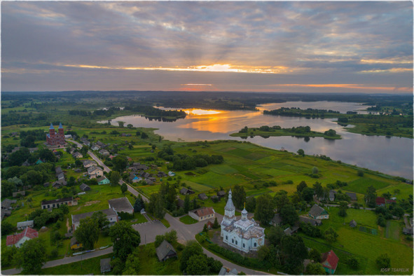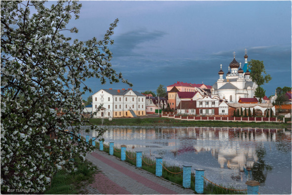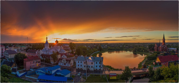 Дремлет летним утром городок притихший,Солнца луч играет в куполах и крышах,Посылает озеро в синеве зеркальнойНочи уходящей поцелуй прощальный,Окна и деревья солнцу улыбаются,А луга и пашни с небом обнимаются,Лишь для спящей площади в сонной кинохроникеВсе еще играют цимбалы и гармоники…