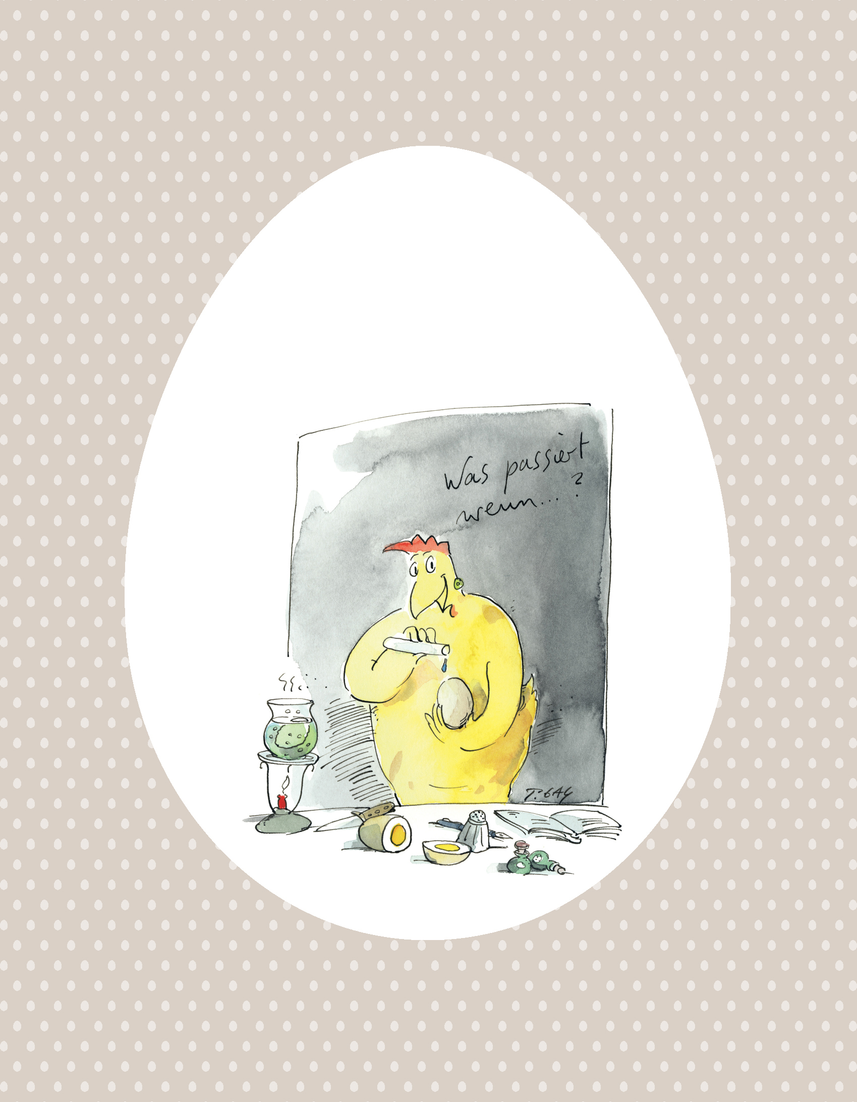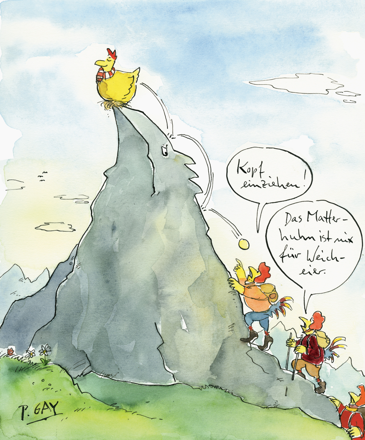 Obwohl die Schweizer nur 175 Eier pro Jahr konsumieren, muss auch die Schweiz Eier importieren – fast 40 Prozent des Eierbedarfs. Das ist viel, sehr viel und lässt Raum für Spekulationen: Taucht man tief in die aktuelle Schweizer Eierliteratur ein, so ist zu lesen, dass es den Schweizer Hennen recht gut geht. 75 Prozent der in der Schweiz gehaltenen Legehennen haben regelmäßigen Auslauf! Aber könnte hierin nicht auch gleichzeitig die Ursache für den hohen Import liegen? Wenn wir uns die geografischen Verhältnisse einmal genau vor Augen halten, dann wird klar, dass so ein spazieren gehendes Huhn durchaus einmal ins Gebirge und damit in abschüssiges Gelände gelangen kann. Wir stellen daher – rein wissenschaftlich – die Hypothese auf, dass der hohe Eierimportanteil der Schweiz durch die vielen hohen Berge verursacht wird. Nicht selten nämlich kullern von den Gipfeln und Hängen die Eier, der Gravitation ausgeliefert, ins Tal, wo sie schließlich entzweigehen.