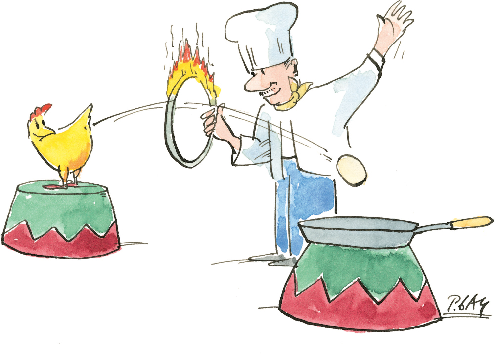 This-Benckhard hat den Spiegeleiern bzw. »Les oeufs sur le plat« in »Kulinarische Genüsse« ein eigenes Kapitel gewidmet. Hier die beiden wichtigsten Regeln, die sich unmittelbar aus unseren naturwissenschaftlichen Erkenntnissen dieses Experiments ableiten lassen: Das Ei bei nicht zu großer Hitze braten, damit das Wasser im Eiklar erhalten bleibt und dieses so seine Elastizität erhält.