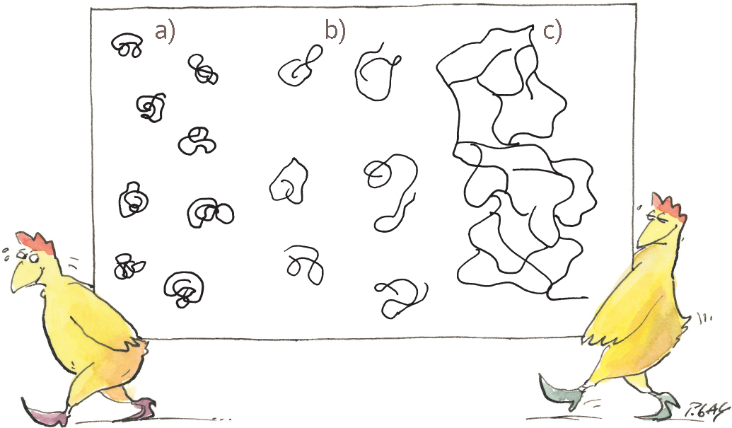 Das Eiklar des Hühnereis besteht zu rund 10 Prozent aus Eiweiß, auch Protein genannt; der größte Teil des Eiklars, nämlich 88 Prozent, besteht aus Wasser.4 Im rohen Ei, in dem das Eiklar noch flüssig vorliegt, haben die Proteine eine Struktur, die mit einem langen Faden vergleichbar ist, der sich ein wenig kräuselt. Im rohen Zustand liegen diese Protein›fäden‹ isoliert vor, sind also untereinander nicht verbunden. Ähnlich wie Haaren, die leicht durchkämmt und aneinander vorbeigeschoben werden können, gelingt es auch den Proteinen im flüssigen Eiklar problemlos, aneinander vorbeizugleiten; das Eiklar ist beweglich wie andere Flüssigkeiten auch. Das Licht kann zudem durch die Fäden hindurchleuchten, weshalb das Eiklar durchsichtig erscheint. Erhitzt man nun das Eiklar, dann wird die vorgegebene Struktur der Proteinfäden des Eiklars nach und nach verändert: Die zunächst isolierten, nur zusammengewickelten Proteine werden entfaltet. An den Stellen, an denen zuvor die verknäulten Eiweiße miteinander verbunden waren, bilden sich nun Verbindungen mit benachbarten Eiweißen aus und bleiben wie die beiden Teile eines Druckknopfs fest miteinander verbunden – man sagt auch: Sie gerinnen oder koagulieren. Dadurch verlieren sie ihre Beweglichkeit und das Eiklar wird zunächst weich und weiß und dann allmählich immer härter. Die Farbveränderung können wir damit erklären, dass das Licht nun nicht mehr ungehindert durch das Eiklar hindurchtreten kann, sondern von dem Proteingeflecht reflektiert wird: Es erscheint weiß.