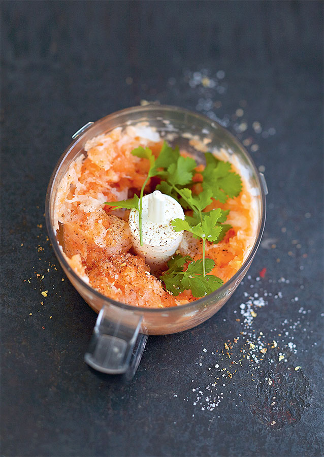 • Очистите и порубите 1 маленькую луковицу и 2 зубчика чеснока. Помойте и порубите 2 веточки кинзы. Смешайте в миске 1 столовую ложку хариссы и 1 столовую ложку теплой воды. Добавьте 200 г домашнего майонеза, лук, чеснок и кинзу; перемешайте. До подачи держите соус в холодильнике.