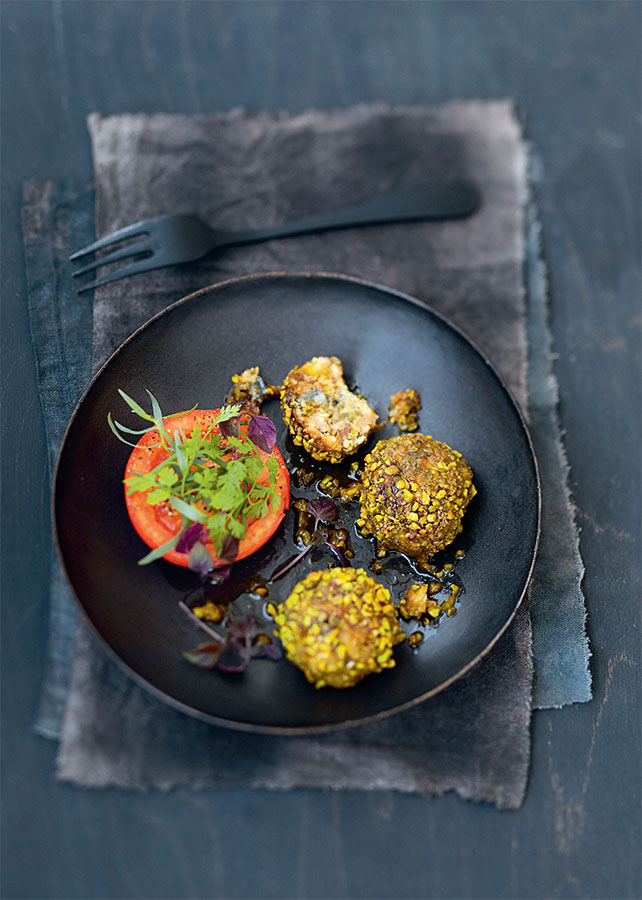 • Насыпьте оставшиеся молотые фисташки в тарелку. Сформируйте митболы величиной с большой грецкий орех и обваляйте в фисташках, слегка надавливая, чтобы они лучше прилипали.