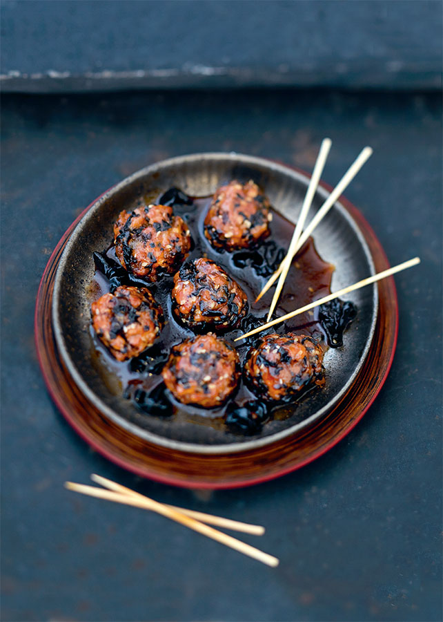 • Быстро обжарьте митболы в оставшемся масле на сковороде, поставленной на сильный огонь. Влейте соевый соус и терияки. Добавьте куски грибов и готовьте на сильном огне в течение 5 минут, перекатывая митболы в соусе, чтобы как следует покрыть их глазурью.