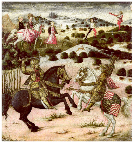 Рыцарь. На переднем плане пейзажа два рыцаря на лошадях сражаются поднятыми мечами. На заднем плане – сцена охоты с двумя женщинами на лошадях