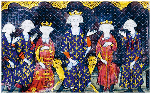 Филипп IV с семьей. Слева направо: сыновья короля Карл Красивый и Филипп Высокий, дочь короля Изабелла Французская, сам король, его сын Людовик Сварливый и брат короля Карл де Валуа