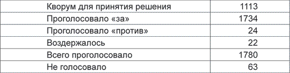 Наконец, нам необходимо избрать ещё одну рабочую группу Съезда (её список тоже у вас на руках) – группу народных депутатов для контроля за работой электронной системы подсчета голосов. Кто за то, чтобы избрать эту рабочую группу, прошу проголосовать. Решение принято.