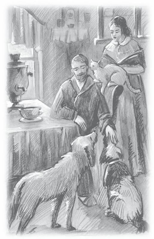Дети, присмиревшие было в маленькой комнатке, разговорились: полились расспросы, рассказы, стали катать яйца… Туда, в комнату, живо явились Каро и Резвый (собаки Семена Васильевича), начались ученье и возня; затем ходили всей гурьбой смотреть западню; смотрели, не взошли ли семена на двух грядках в саду; а потом Семен Васильевич стал им читать сказку. Дети слушали.