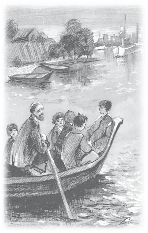 Они отплыли от берега ровно в 5 часов утра. Семен Васильевич сидел на руле, четверо мальчиков, имея по одному веслу, старательно гребли; остальные приютились тут же в лодке…