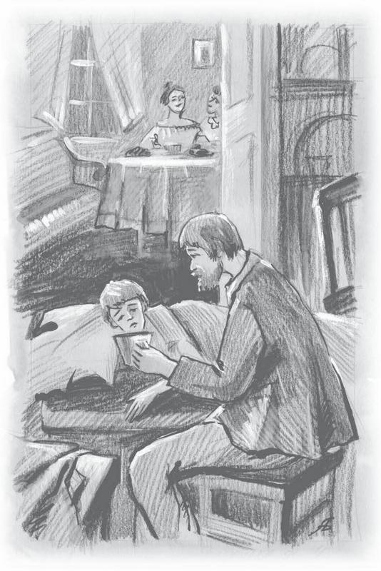Сидя около Наташи, в полузабытьи закрывшей глаза, Николай Васильевич с грустью смотрел на нее и думал, что она маленькая и одинокая, растет без ласки отца и матери, никому не дорога и не знает детских радостей, не видит веселья. Положим, Петенька жалеет Наташу, но ведь у него есть своя дочь и он боится Марьи Ивановны. Наташу же некому пригреть… А какой ребенок не жаждет ласки и не льнет к доброму человеку?!