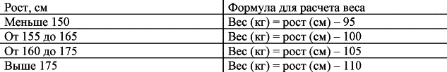 Вес = 50 + (рост – 150) × 0,32 + (возраст – 21) / 5.